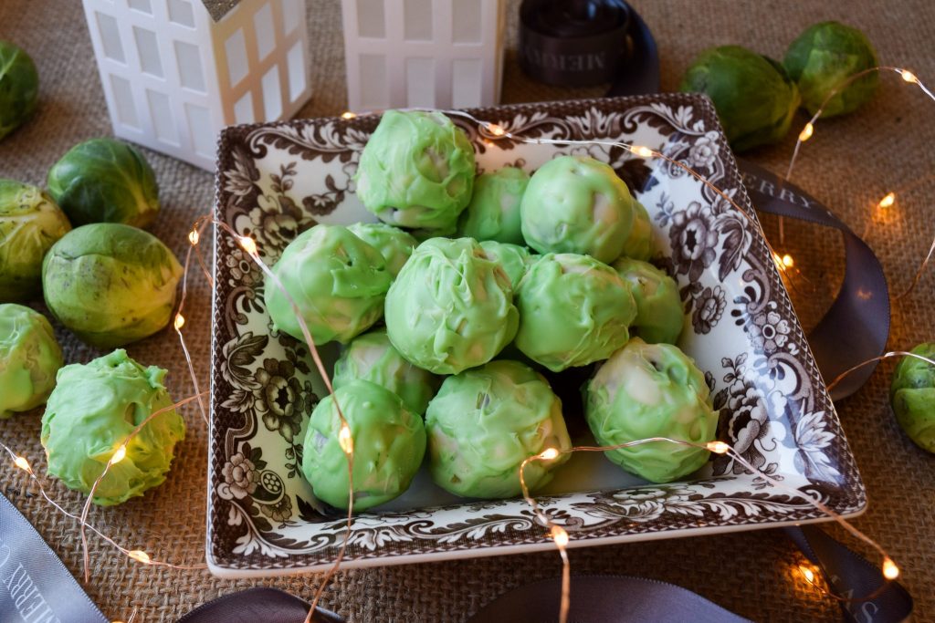 These realistic Brussels Sprout chocolate truffles house a rich chocolate, cognac and sea salt ganache inside a crisp white chocolate shell.